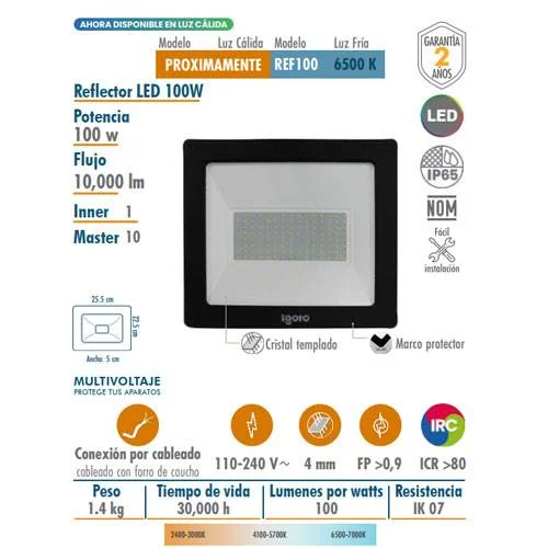Reflector Led Extra Plano Intemperie 50,000h 100-260v~ 100w 8000lm