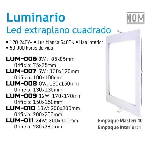 Descripción:- MEDIDA 150X150MM, ORIFICIO DE 130X130MM, ALIMENTACION 120-240V~, LUZ BLANCA 6400K, 50000 HORAS DE VIDA